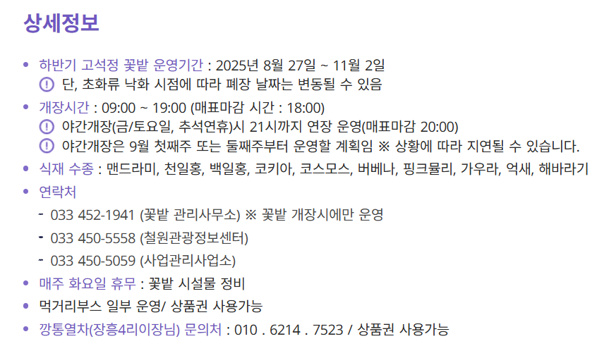 또한 감면 대상 입장료 제도가 있어 대인은 5,000원, 소인은 2,000원으로 할인 혜택을 받을 수 있고, 철원군민은 신분증을 지참하면 무료로 입장할 수 있습니다. 덕분에 지역 주민들도 부담 없이 꽃밭을 즐길 수 있죠.